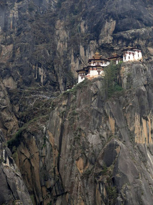 Tu viện Taktsang, còn được biết đến với cái tên “Nơi ẩn náu của hổ”, nằm trên một vách đá dốc cao 900m so với thung lũng Paro. Sườn núi rất dốc gần như là thẳng đứng và các tòa nhà của tu viện được xây dựng áp sát lưng vào các vách đá.