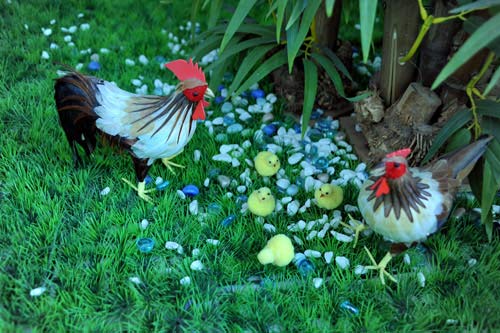 Từ cầu thang lên lầu, một cặp gà rất dễ thương được dùng làm cảnh trang trí trong nhà