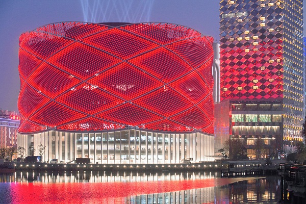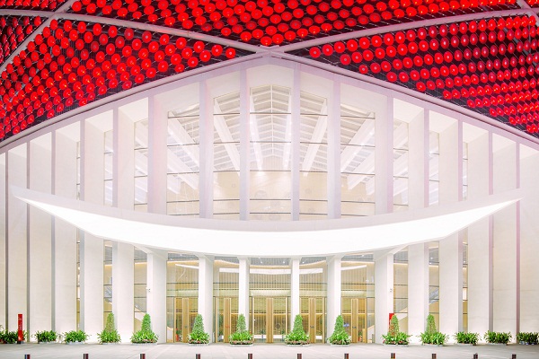 Phần trung tâm hình lồng đèn được nâng đỡ bởi các vòm thép hình ống giao nhau, phủ quanh nhà hát theo hình ống với các tấm lưới cáp được treo căng thành mạng lưới, qua các lỗ chấu hình thang tại các vòng giao nhau.