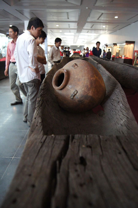 Chiếc thuyền độc mộc với hiện vật kèm theo tại Trung tâm Nguyên cứu và bảo tồn cổ vật của UNESCO.