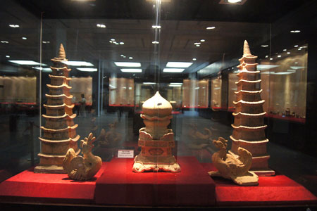 Những tác phẩm điều khắc thời Trần gồm tượng chim uyên ương và mô hình chùa tháp trong bộ sưu tập của nhóm sưu tập Cửa Đông, Hội cổ vật Thăng Long.