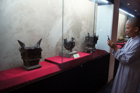 Một nhà tu hành ghi hình những chiếc Lư hương thế kỷ 18 tại khu trưng bày cổ vật Hà Nội.