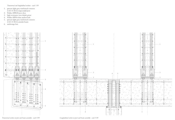 Điều đặc biệt của công trình này đó chính là các thanh bê tông, trụ bê tông phụ được hoàn toàn đúc sẵn, lắp với nhau tạo thành một hệ thống, kết nối với 4 trụ chính của công trình qua công nghệ lắp nối bê tông Peikko được đầu tư kỹ thuật khá mạnh tay.