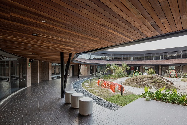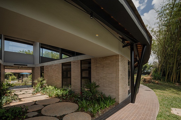 Lối ra vào không gian bên trong trường học lại mang lối thiết kế đơn giản hơn, gồm các đế đất nung hình lá nong tằm lớn nhỏ xếp xen kẽ với bụi cây bản địa.