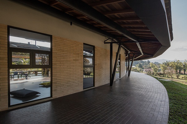 Phần mái hiên hình tròn của tầng trên được đỡ bằng chân đế thép dày dặc, cùng phần mái ốp gỗ khép kín.