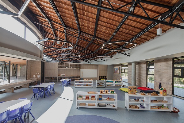 Còn đây là quang cảnh bên trong của lớp học mẫu giáo. Hệ thống vòm thép hình cung cũng nổi bật, đóng vai trò quan trọng trong việc nâng đỡ tầng mái.