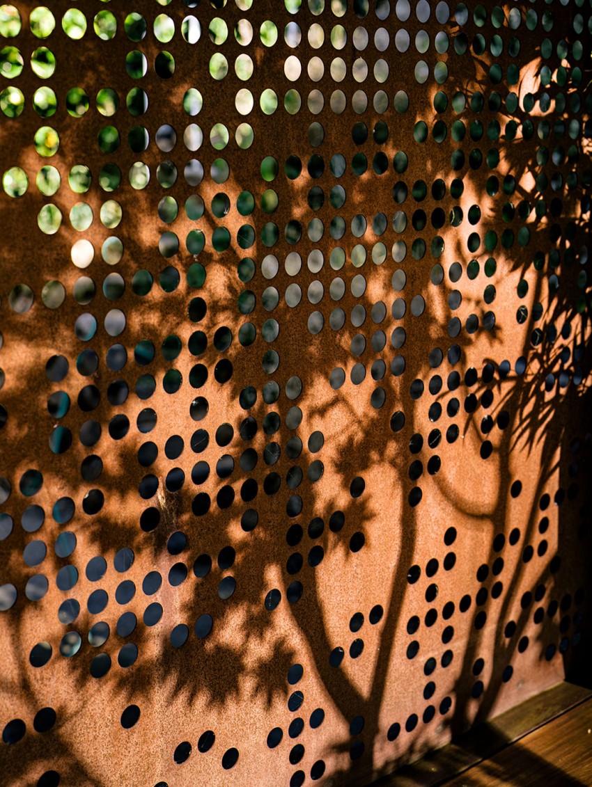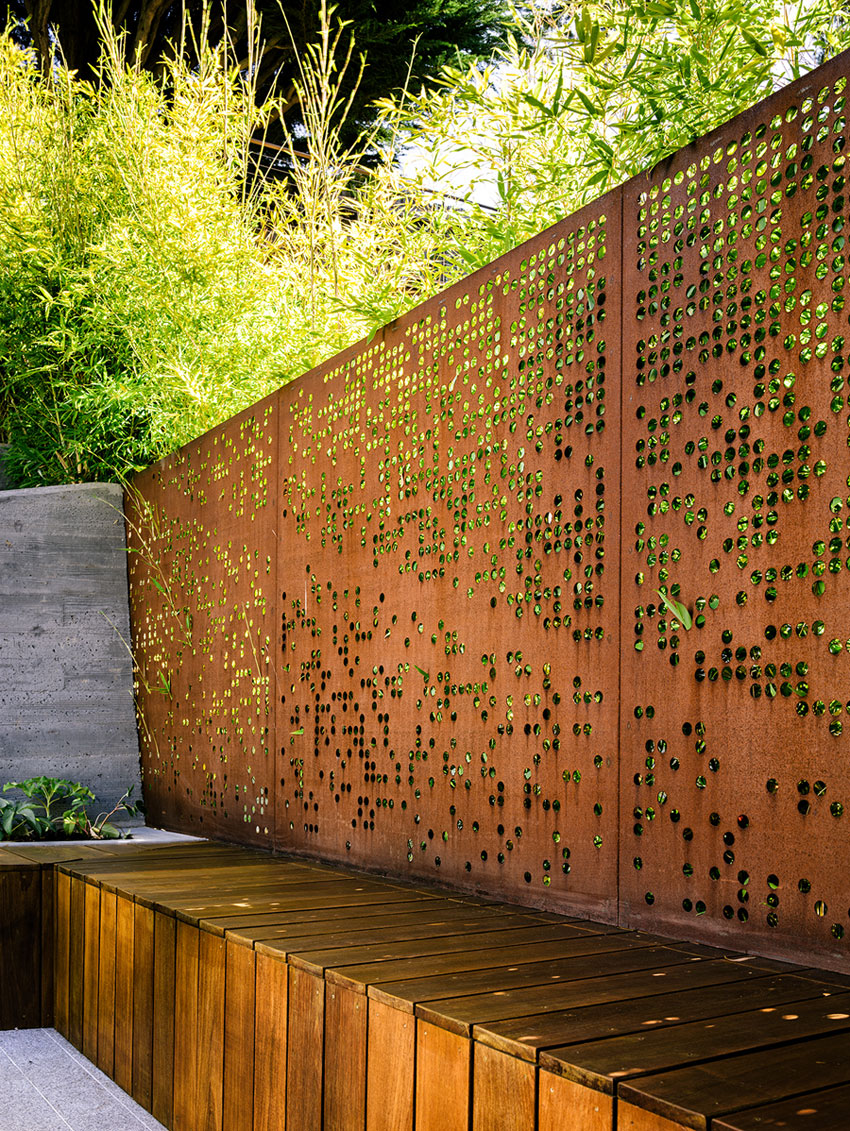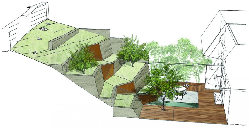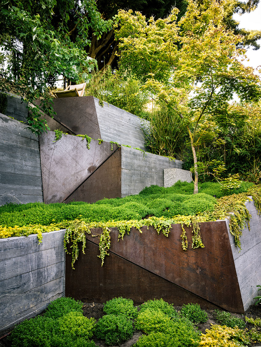 Khu vườn được tổ chức thành từng khu vực trồng cây theo kiểu bậc thang, bao gồm một sân thượng, hồ nước, cây xanh và khu vực chỗ ngồi.Xen kẽ những con đường đi và những bậc thang bê tông là thảm thực vật xanh tươi.