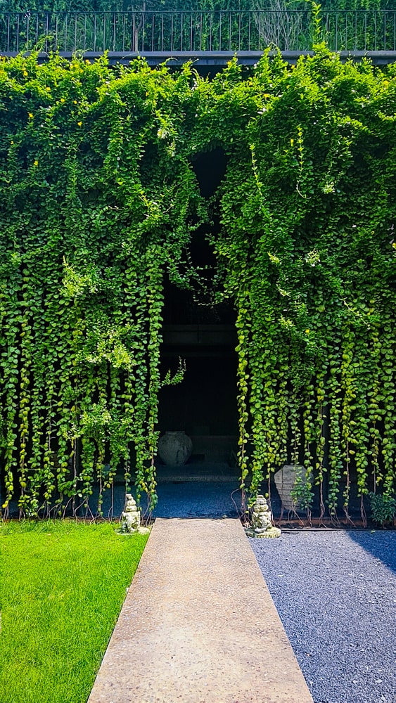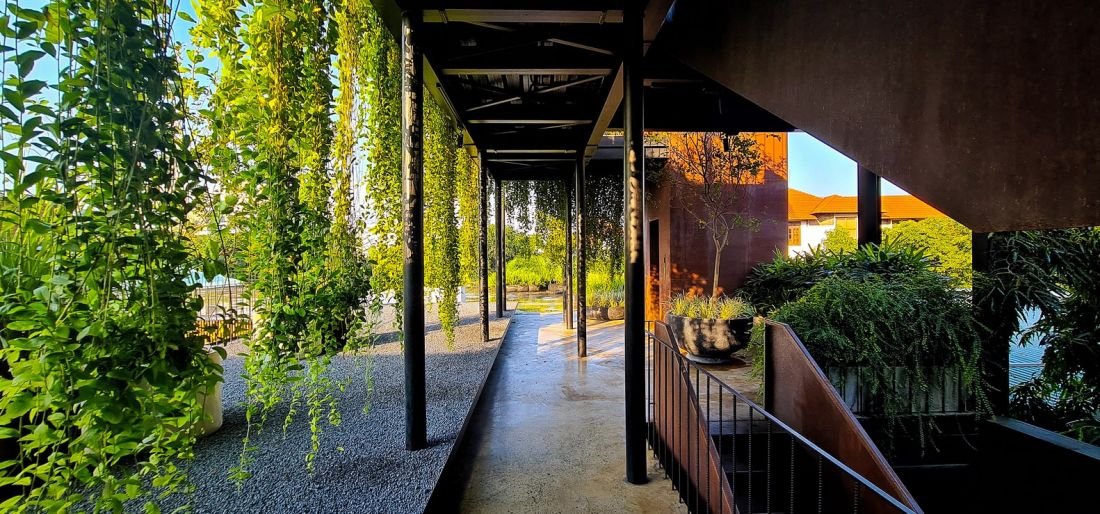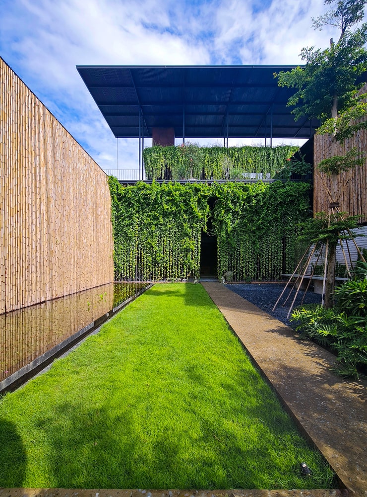 Đằng sau lớp dây leo là vùng chuyển tiếp dọc hành lang. Việc quy hoạch không gian chuyển tiếp này tạo sự thích nghi nhiệt độ trong ngoài. Trong đó không gian dành cho mặt nước chiếm 1/5 diện tích sân vườn, giúp cải thiện vi khí hậu cho các vùng khu vực ngoài trời dưới cái nóng của Miền Nam Việt Nam.