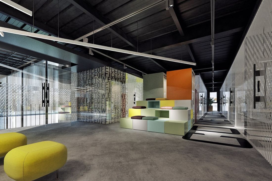 Nhược điểm của tổ hợp văn phòng là nằm trên con đường hẹp trong khu đô thị, vì vậy kiến trúc sư đề xuất một giải pháp quy hoạch tổng thể đa vùng với độ cao chính nằm ở phía trong ngay khu vườn trung tâm.