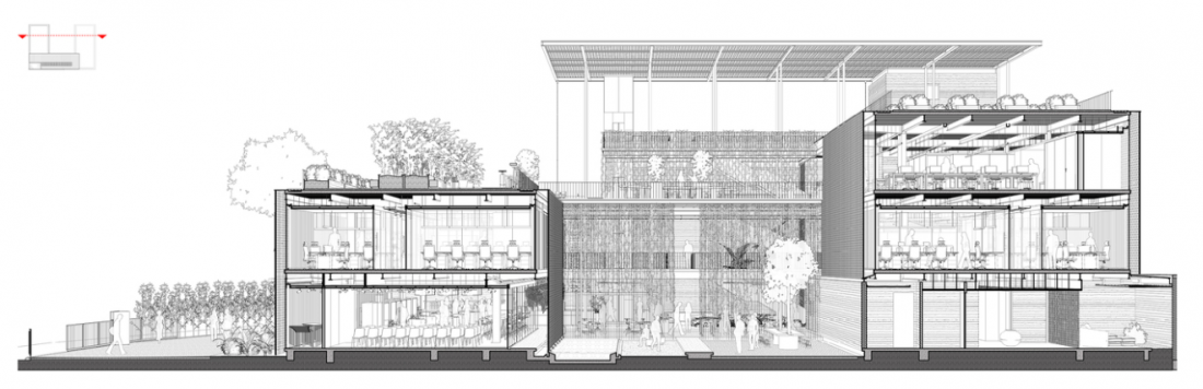 Tất cả các không gian công cộng đều được thông gió tự nhiên. Đồng thời không gian làm việc của nhân viên cũng nhận được nhiều ánh sáng tự nhiên tại các điểm giao nhau với ngoài trời.