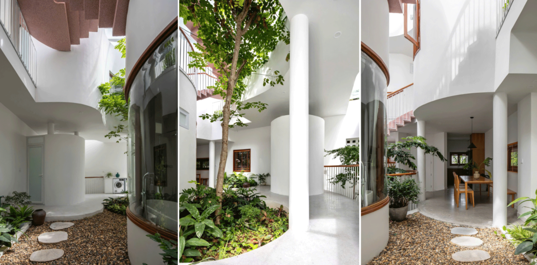 Tuy nhiên, ngay khi bước qua cánh cửa, sự vuông vức nhường chỗ cho những đường cong uốn lượn mềm mại. Lõi nhà được thiết kế rỗng, đóng vai trò là lá phổi xanh của công trình. Đây là nơi hội tụ của ánh sáng tự nhiên, gió sông và những tán cây xanh mát.