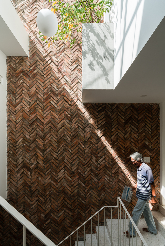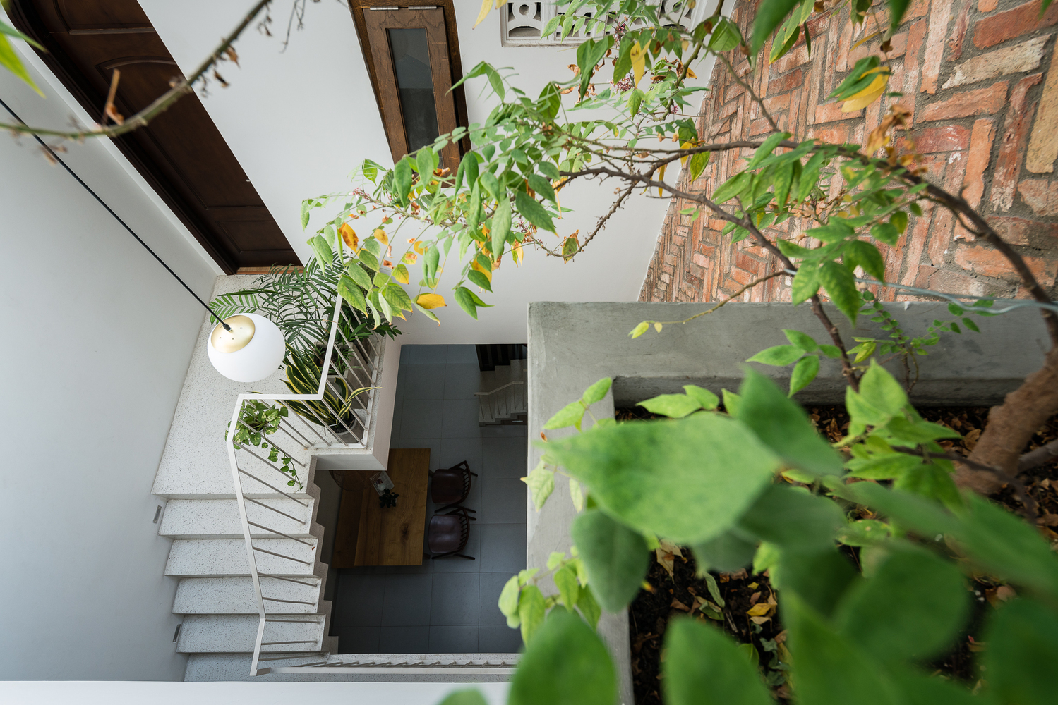 Chiều rộng của ngôi nhà khá hạn chế, nên đã thiết kế bếp dưới cầu thang, với bàn ăn được đặt thẳng dưới giếng trời để tối đa hóa ánh sáng và gió lưu thông qua bên trong.