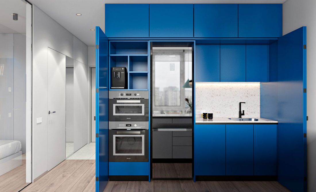 Một căn bếp nhỏ được gói gọn trong tủ màu xanh lam, giúp không gian được gọn gàng, tinh tế.
