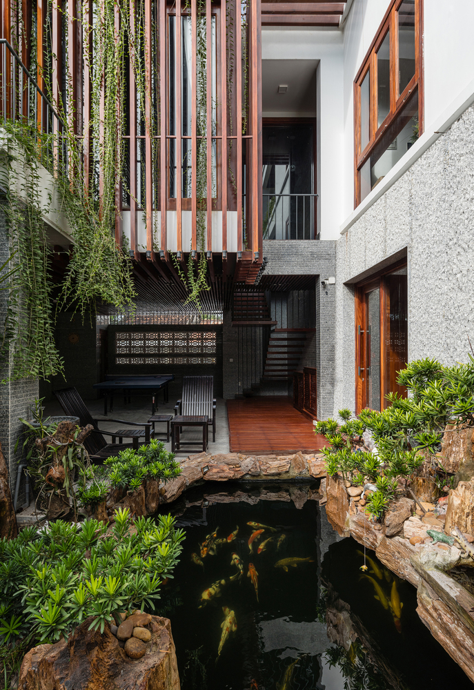 Khu vườn rộng lớn được thiết kế và bố trí cạnh không gian sống của gia đình hai thế hệ - đây cũng là chủ nhân của ngôi nhà. Mặt tiền như tấm rèm xanh có tông màu trầm ấm của gỗ tự nhiên vừa để giảm bức xạ nhiệt vừa mang đến bóng mát thơ mộng sau một ngày dài trở về nhà.