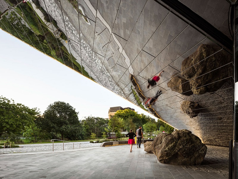 Một quảng trường bên ngoài tòa nhà liên kết với các lối vào của trung tâm, dẫn vào một tiền sảnh sáng sủa với những bức tường gỗ có rãnh và một quầy lễ tân lớn làm từ đá.