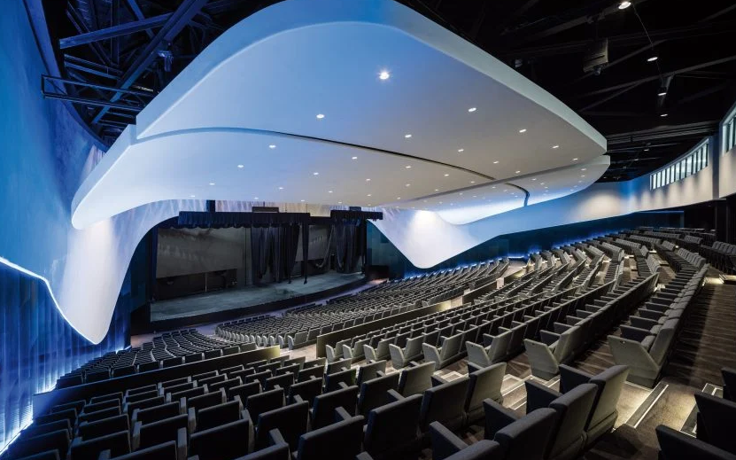 Không gian bên trong khán phòng, các hình thức cũng được bắt chước uốn lượn giống hình dáng cong của bên ngoài tòa nhà được phản ánh qua các tấm màu trắng quét trên các bức tường.