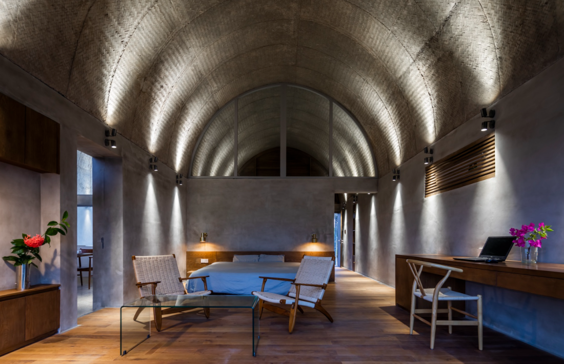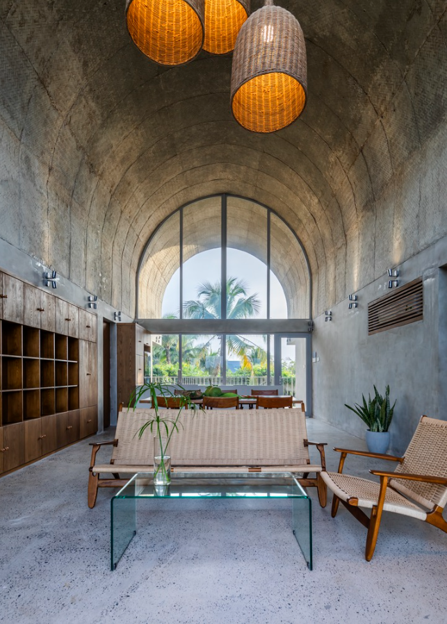 Việc sử dụng cây xanh như một bức tường sống không chỉ giúp thanh lọc không khí mà còn tạo ra một bộ lọc thị giác tự nhiên. Phòng khách tại tầng 2, ranh giới giữa bên trong và bên ngoài dường như bị xóa nhòa. Gia chủ có thể cảm nhận được hơi ẩm của đất, mùi hương của vườn cây và tiếng xào xạc của lá dừa ngay khi đang ngồi trên sofa. Đây là một giải pháp thông minh giúp không gian cộng đồng luôn thoáng đãng nhưng vẫn giữ được sự kín đáo cần thiết từ xa.Cụm không gian vòm chính này còn được nằm giữa 2 cụm không gian phòng ngủ.