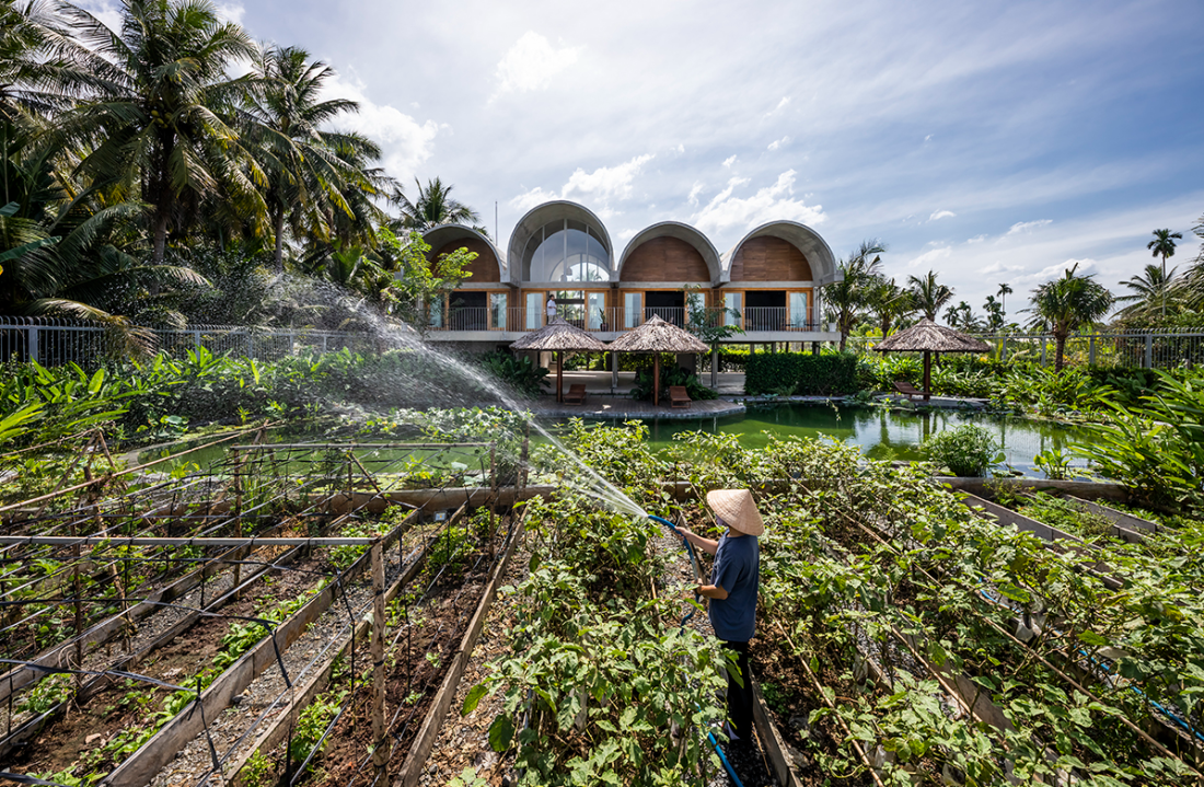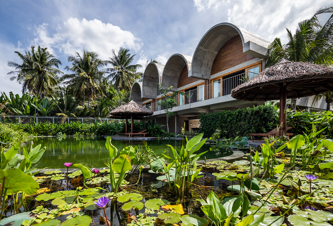 Mặt tiền công trình: Sự thay đổi về quy mô của các khối vòm tạo nên một nhịp điệu nhấp nhô, gợi liên tưởng đến những gợn sóng sông hay những rặng dừa đung đưa theo gió. Những đường cong mềm mại của mái vòm không chỉ mang lại vẻ đẹp điêu khắc hiện đại mà còn giúp điều tiết ánh sáng và hướng gió vào bên trong nhà một cách êm ái hơn.
