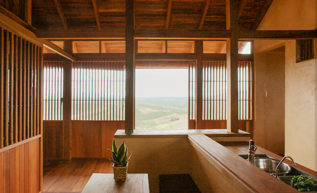 Phía Đông ngôi nhà hoàn toàn mở ra thung lũng. Tại đây, những hệ cửa chớp gỗ thay thế cho những bức tường khô cứng. Chúng không chỉ là lớp vỏ bảo vệ mà còn là lá phổi giúp không khí lưu thông liên tục. Sáng sớm, khi trượt cánh cửa lớn ra ban công, cả thung lũng như tràn vào nhà cùng ánh bình minh.