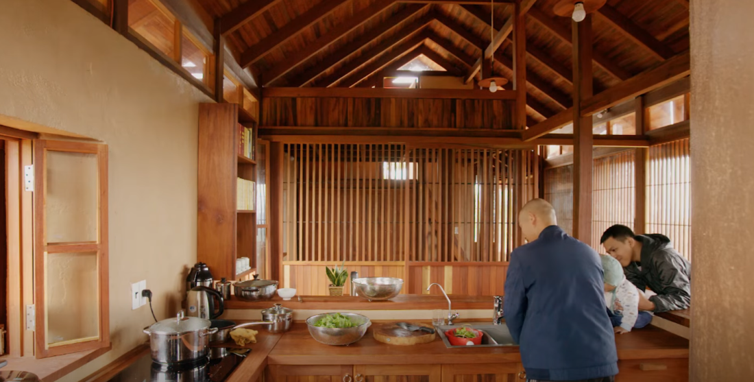Vì địa hình hiểm trở, không một phương tiện cơ giới lớn nào có thể tiếp cận. Mọi vật liệu đều phải nhẹ, nhỏ và dễ vận chuyển. Đó là lý do hệ khung gỗ trở thành xương sống của công trình, cho phép thi công nhanh chóng và giảm thiểu tối đa tác động đến thảm thực vật xung quanh.