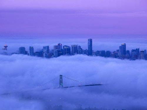 Hoàng hôn tím mù sương trên cầu Lion Gate - Vancouver (Canada).