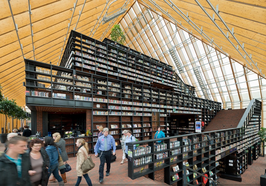 Thông qua mặt tiền bằng kính của nó, bạn có thể nhìn thấy bên trong từ mọi phía, và từ quảng trường thị trấn liền kề, công trình xuất hiện như một núi sách khồng lổ.