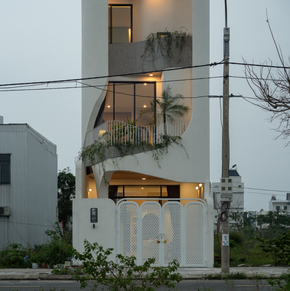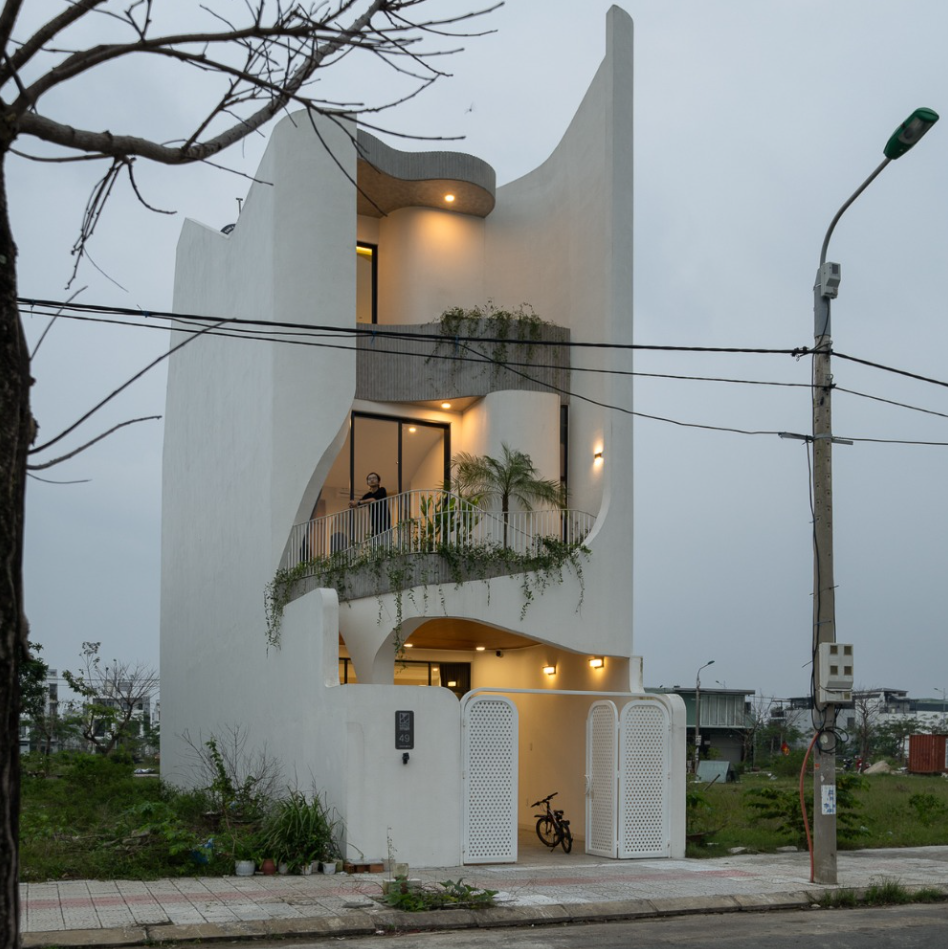 Nằm giữa khu vực ngoại ô Nha Trang với những nếp nhà tự phát, hệ thống hạ tầng chằng chịt và tiếng ồn đô thị đặc trưng, ngôi nhà hiện lên như một khối trắng bo cong tiết chế.