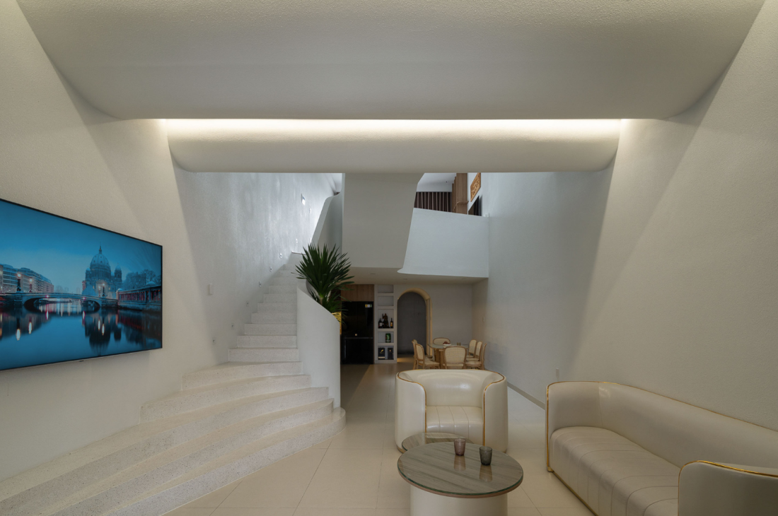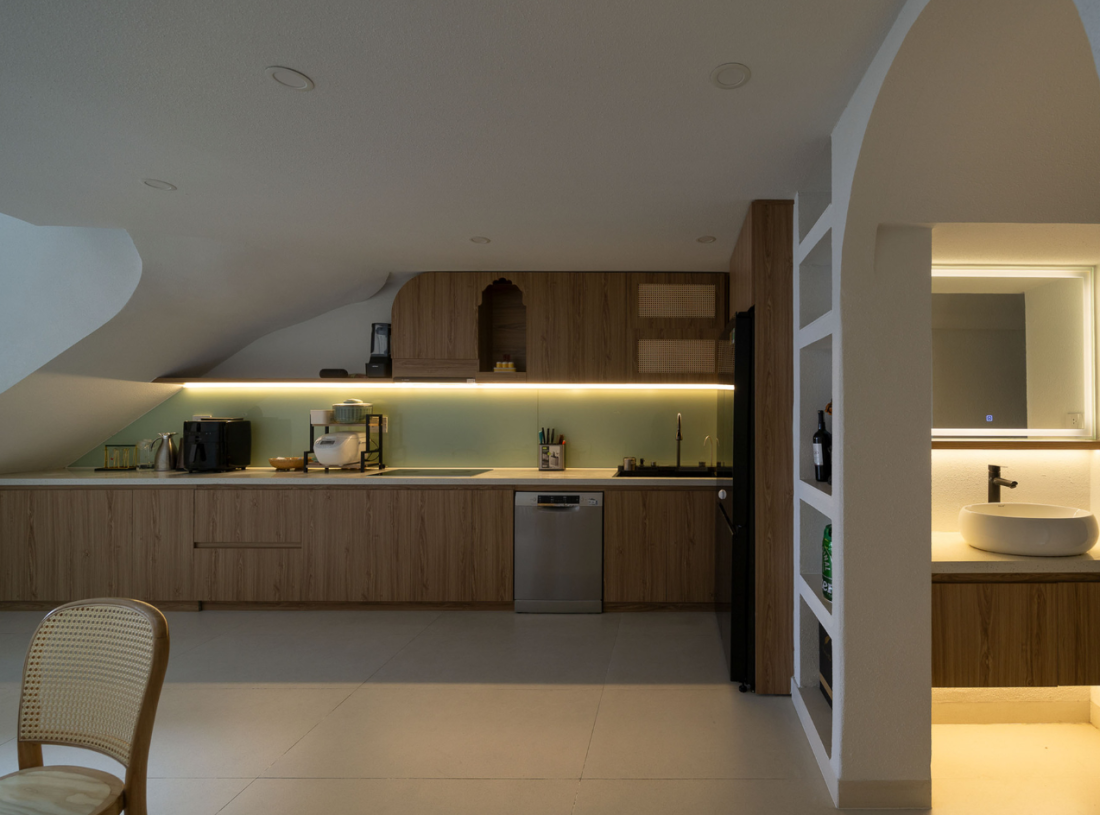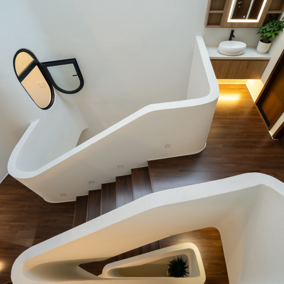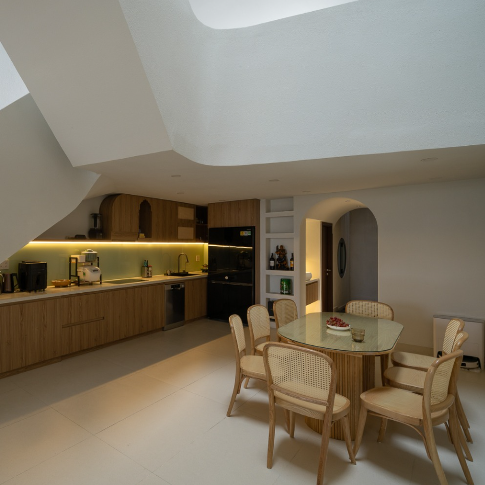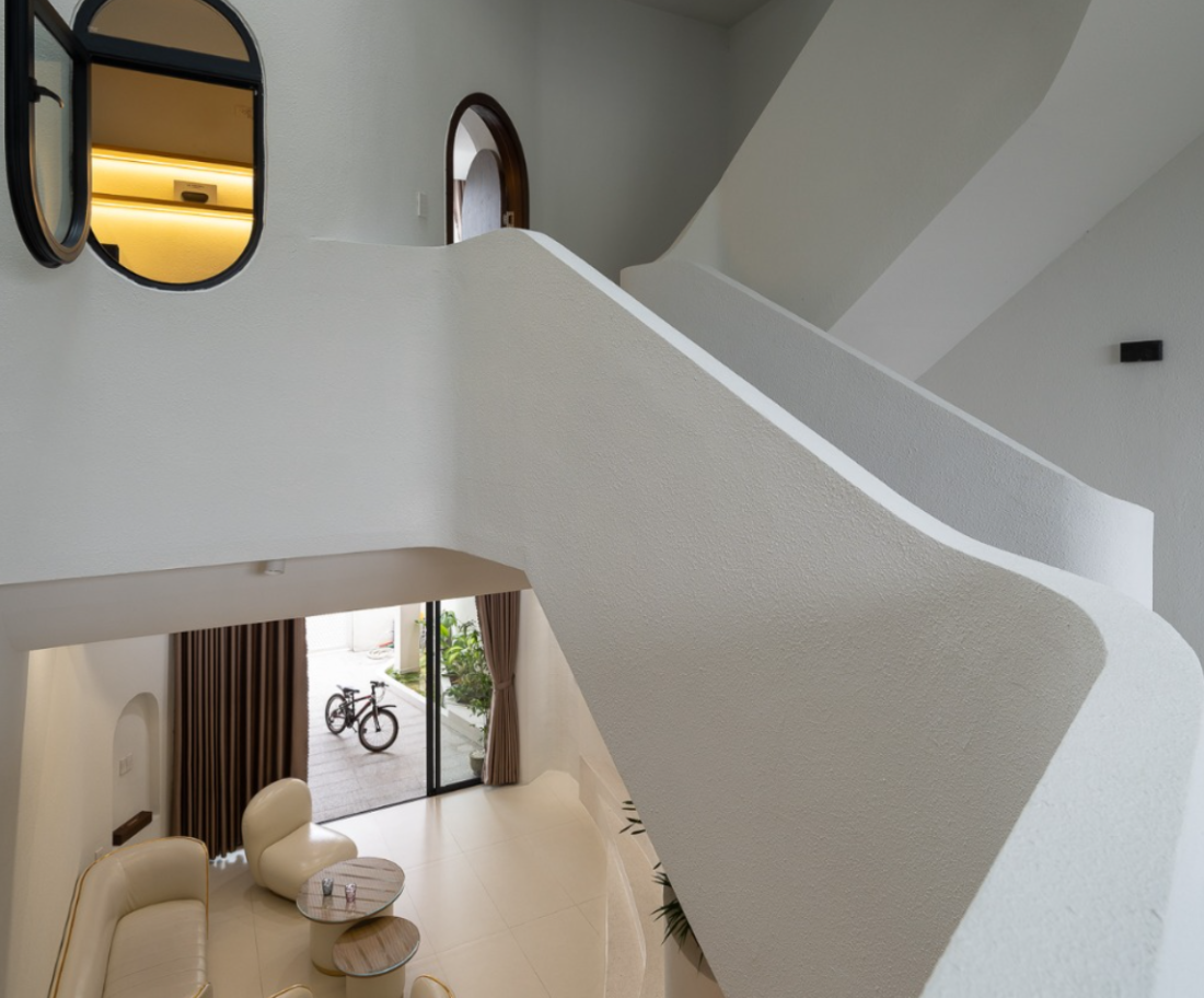 Các bề mặt bo tròn giúp ánh sáng lan tỏa đều hơn, len lỏi sâu vào nội thất, xóa đi cảm giác vụn vặt thường thấy trong nhà ống và tăng thêm cảm nhận về sự rộng rãi, dễ chịu.