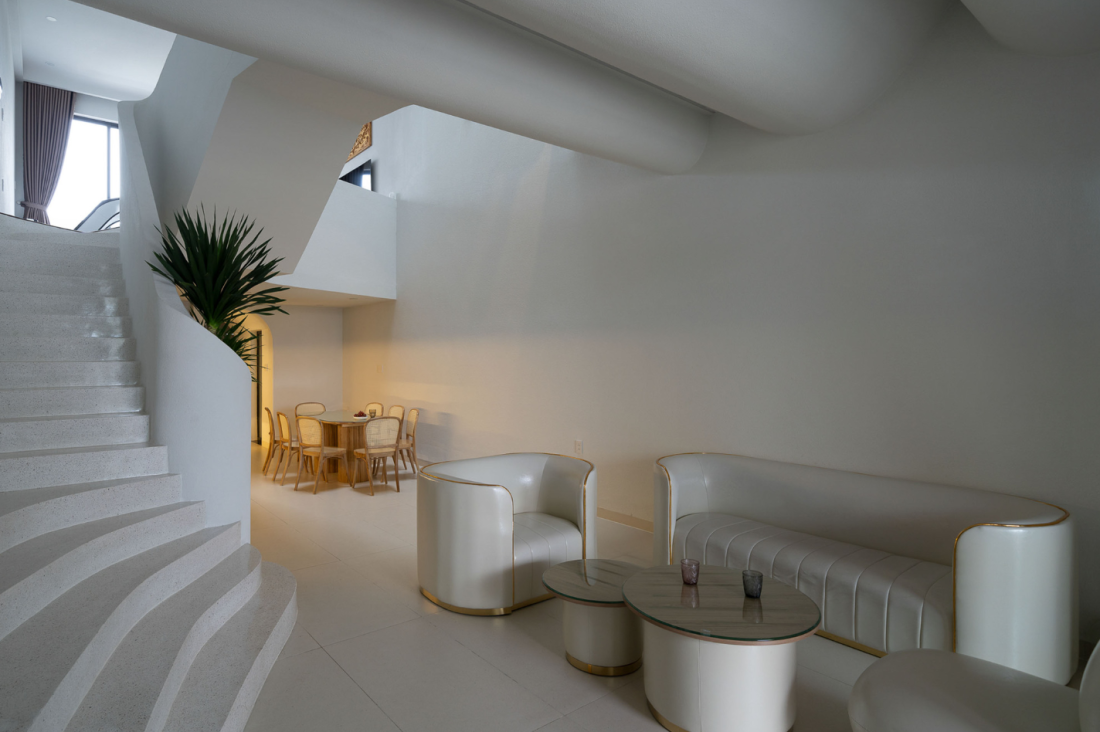 Điểm đặc biệt nhất trong ngôi nhà chính là sự xuất hiện nhất quán của các đường cong. Từ mặt tiền, vòm cửa, trần nhà cho đến hệ lan can cầu thang, những góc cạnh sắc nhọn đều được làm mềm.
