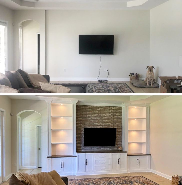 Chỉ cần lắp thêm một chiếc tủ tiện ích và hệ thống đèn chiếu sáng cũng đủ tạo ra một phòng khách hiện đại, ấm cúng.