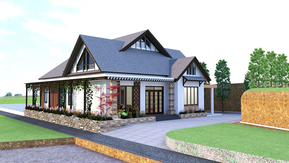 Mẫu nhà 1 tầng ở nông thôn có phần mái thái hiện đại phá cách cùng phần cửa kính sang trọng giúp cho việc lấy ánh sáng một cách tự nhiên được tối đa cho ngôi nhà của bạn.