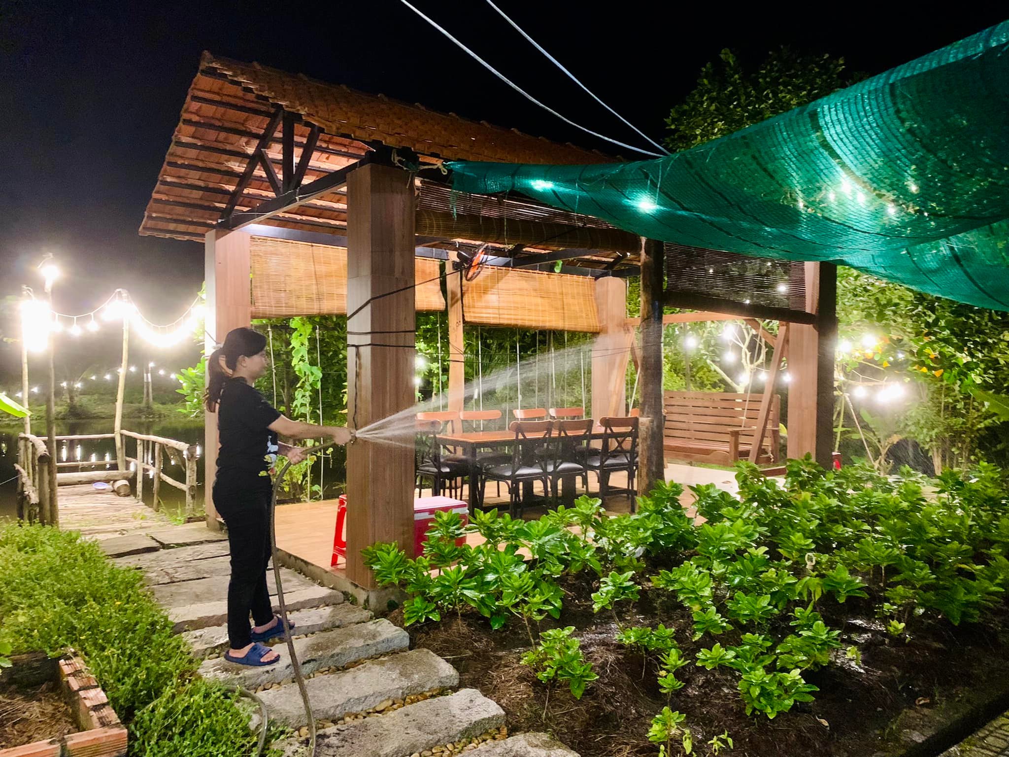 Ở sân vườn, chị Như làm một cái chồi kiểu miệt vườn miền Tây, lợp ngói hỏa tiễn. Ở các góc vườn, chị thiết kế vách tường cam trông xương rồng, cẩm tú cầu và trang trí đèn tròn ngoài trời.