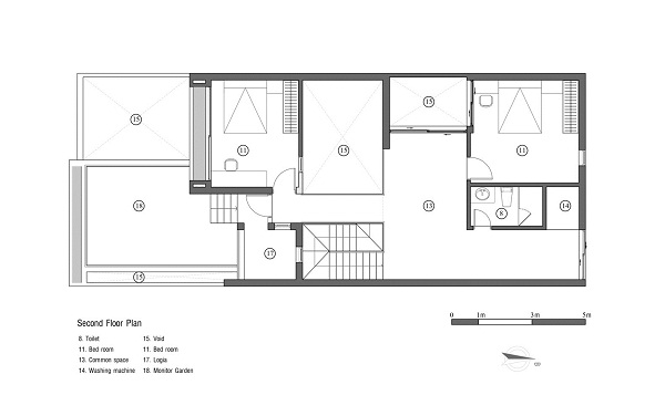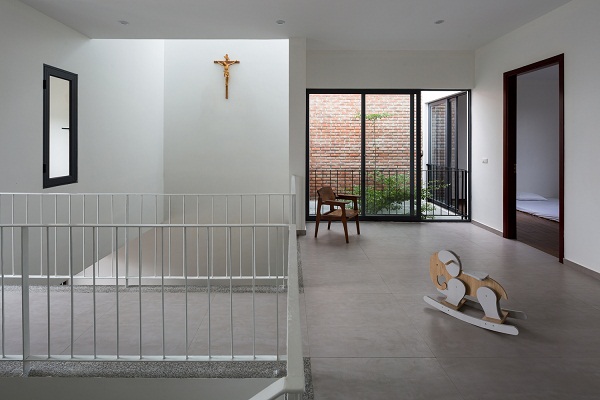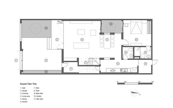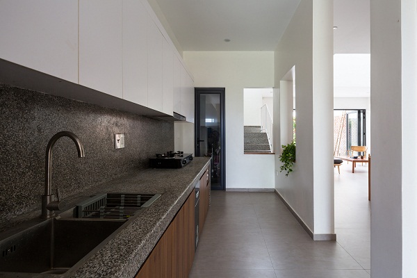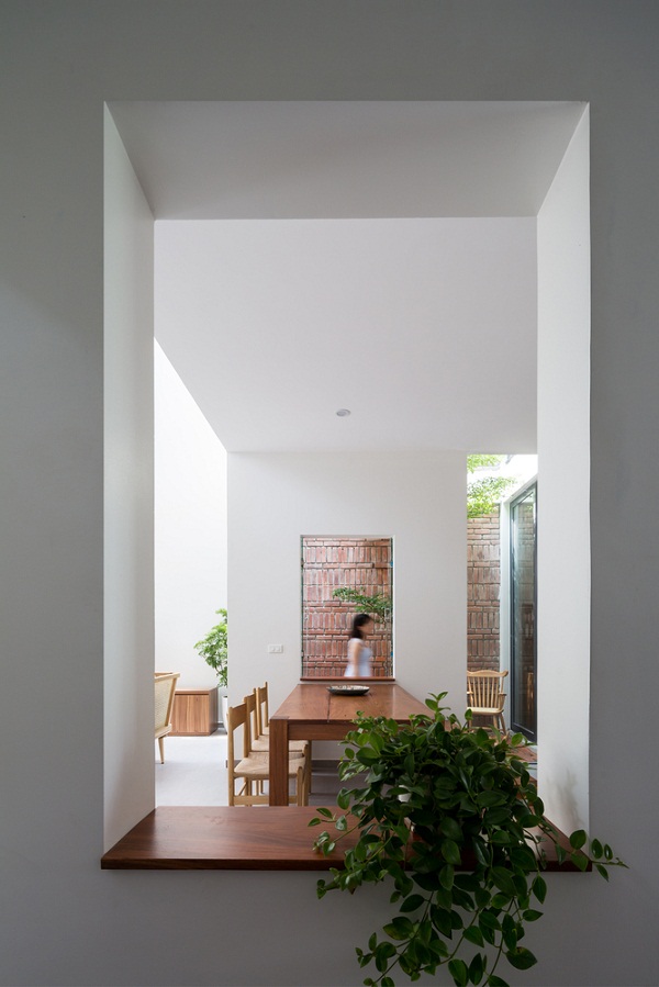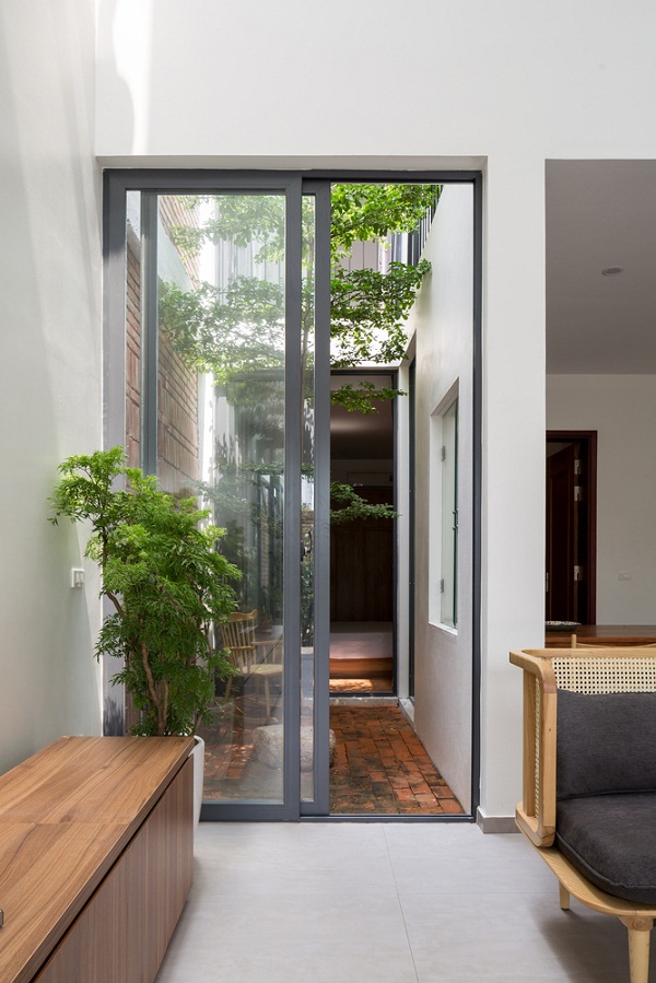 Các không gian chung ở tầng trệt được kết nối với nhau liền mạch, bếp được ngăn cách nhưng lại có sự kết nối với khoảng không gian phía ngoài nhà. Phòng ngủ ờ tầng 1 ngăn với khu vườn nhỏ vừa đảm bảo sự riêng tư nhất định vừa mang đến cảm giác thoải mái, yên tĩnh. Khu vườn nhỏ này cũng thông với tầng trên cùng của ngôi nhà.