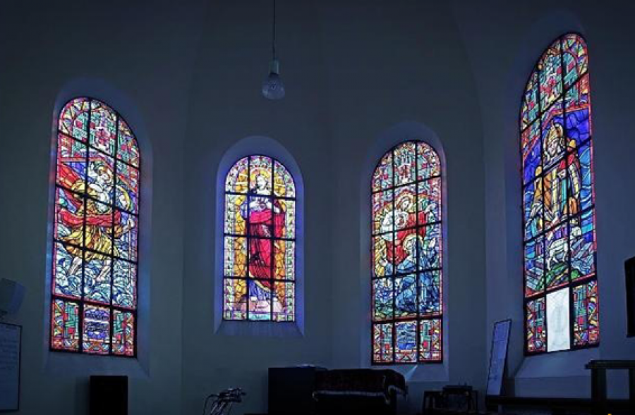 Phần áp mái trang trí bằng 70 tấm kính màu do xưởng Louis Balmet ở Grenoble (Pháp) chế tạo, mang một phong cách đặc trưng riêng của những nhà thờ Châu Âu. Những tấm kính màu này sẽ làm cho không gian bên trong nhà thờ trở nên nổi bật và trang nghiêm hơn bao giờ hết. Vừa có tính nghệ thuật, vừa có tính thẩm mĩ mà lại giúp cho không gian nhà thờ trở nên sáng hơn và rộng rải hơn.