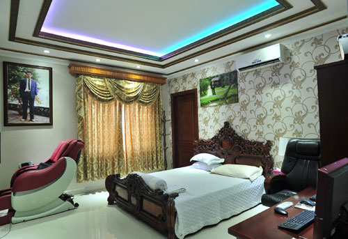 | Phòng làm việc của chồng Trang Nhung nổi bật với tông màu vàng sang trọng. Đây là nơi diễn ra những buổi gặp gỡ đối tác, hoặc họp hành với các nhân viên trong công ty. |