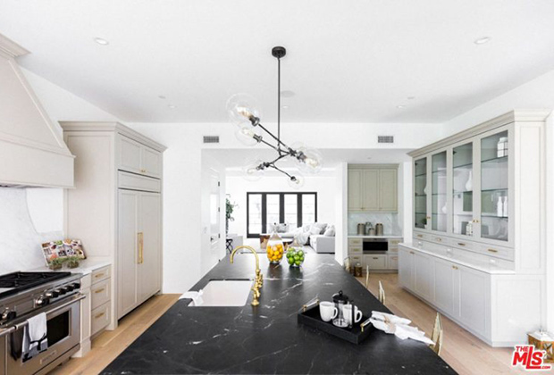 Nhà bếp mở rộng được trang trí với các thiết bị hiện đại, tủ tùy chỉnh và bàn bằng đá cẩm thạch.
