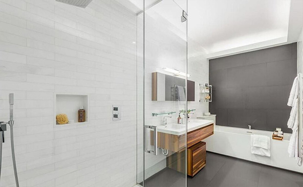 Phòng tắm cực kỳ hiện đại có vòi sen và gần như hoàn toàn được lót bằng gạch đá cẩm thạch.