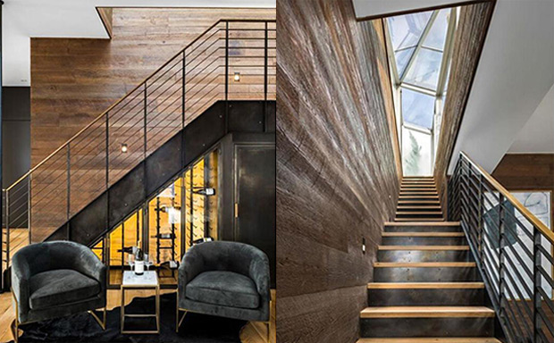 Cầu thang bằng đồng dẫn lên sân thượng, phía dưới được bố trí thêm kệ rượu tạo nên sự sang trọng, độc đáo.