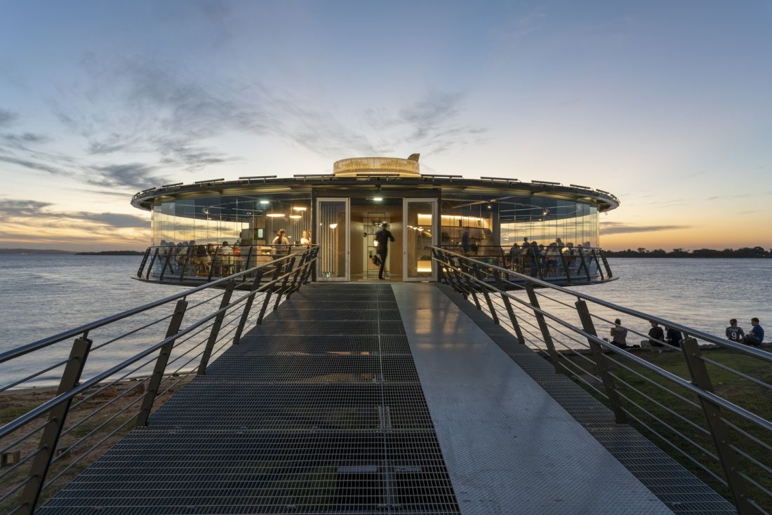Nói cách khác, nhà hàng này là một lăng kính hình trụ, có vẻ kiến trúc bên ngoài ngoài gợi lên phong cách kiến trúc công nghiệp của những năm 1930 và 1940.