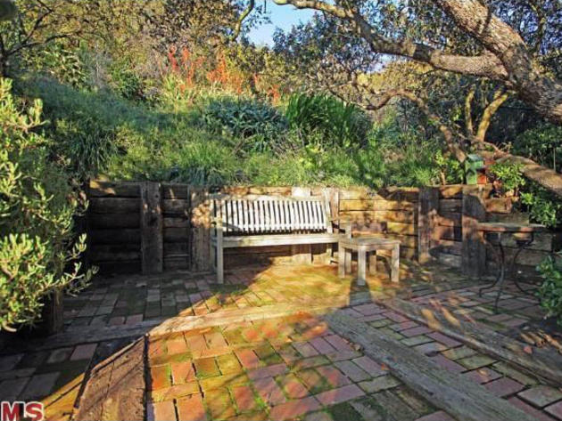 Sân gạch và ghế gỗ thư giãn trong vườn.