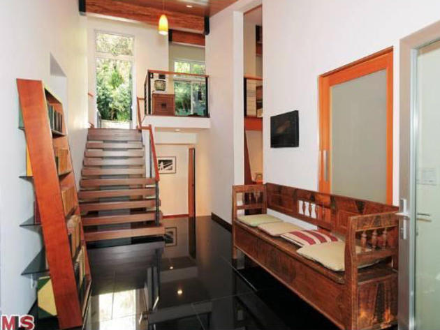 Lối vào của căn hộ với các đồ nội thất gỗ tạo sự tương phản với nền nhà đen bóng.