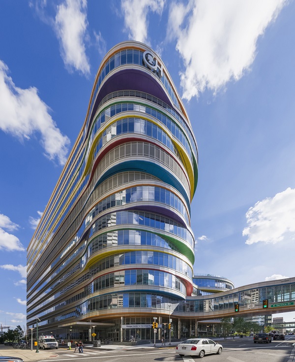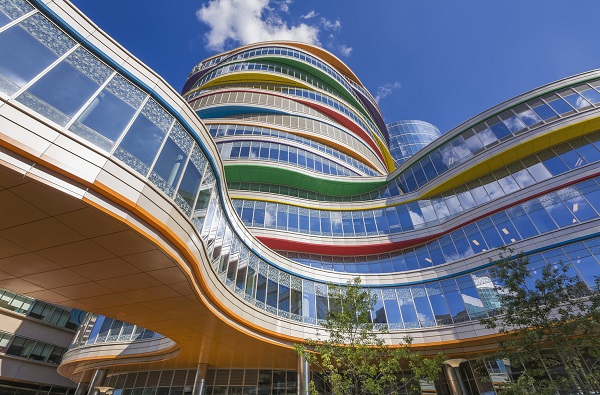Trung tâm chăm sóc sức khỏe nhi khoa Buerger nằm trong khuôn viên chính của CHOP ở West Philadelphia, bao gồm các vòng hình cung xếp chồng lên nhau, nhấp nhô mang nhiều màu sắc khác nhau.