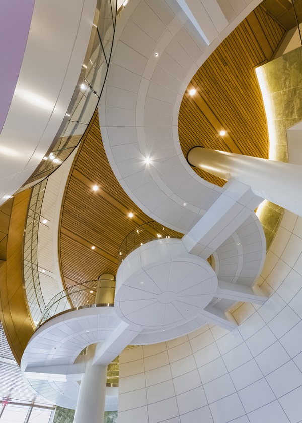 Phần sảnh rộng rãi và tràn ngập ánh sáng với một đoạn đường cong uốn lượn đầy kịch tính.