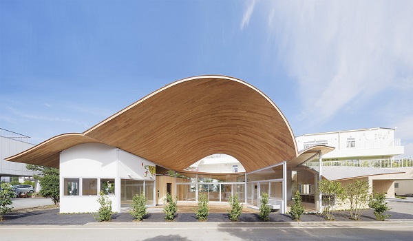 Ngay cái nhìn đầu tiên, Vườn ươm Toranoko gây ấn tượng với phần mái gỗ cong lượn, kéo dài ở các góc, tạo ra các góc nhìn trực quan bắt mắt.