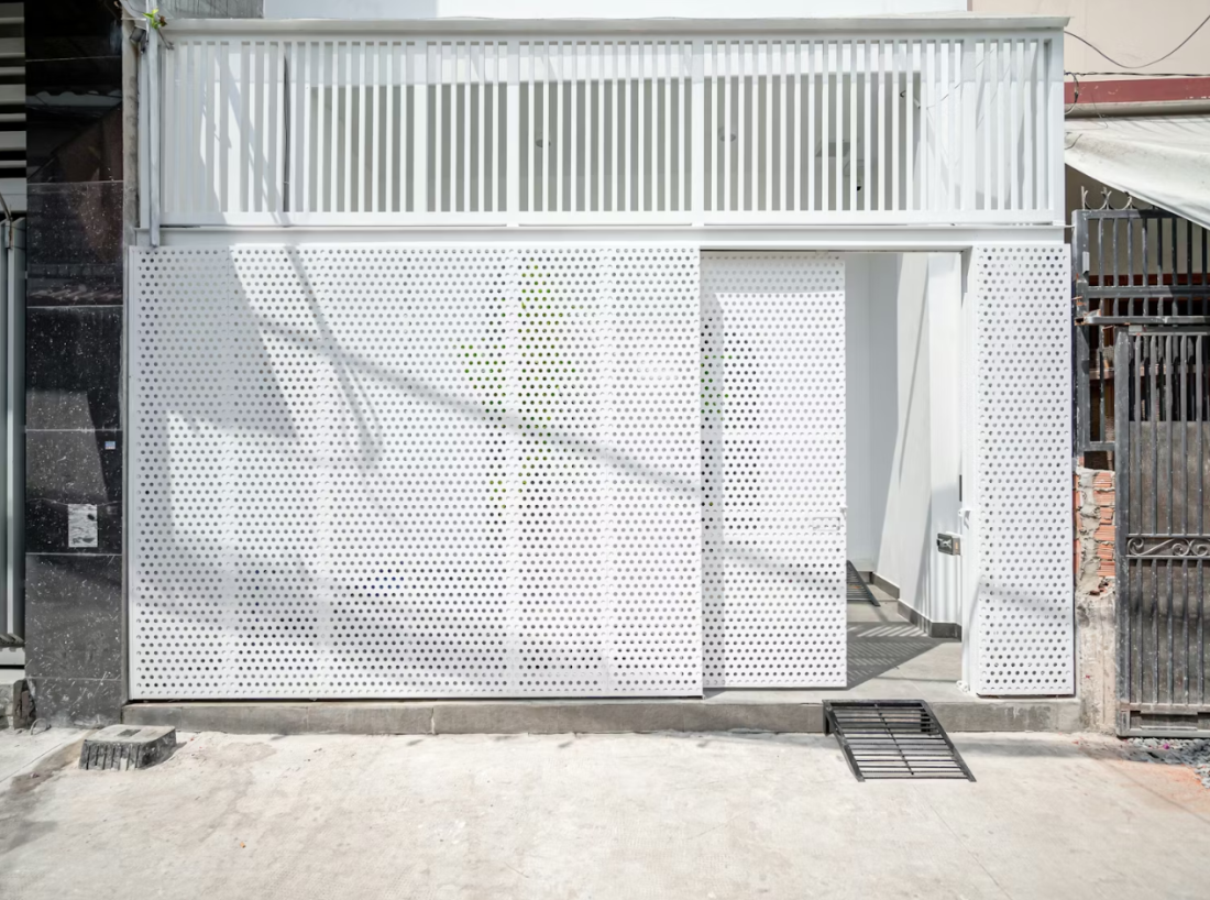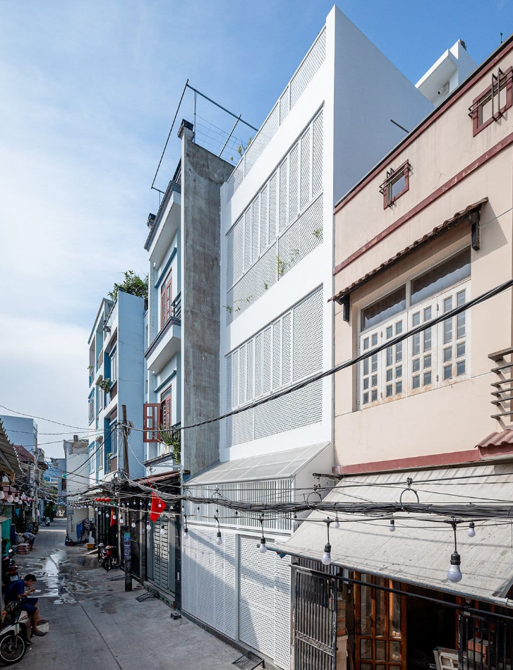 Với đặc thù nhà phố hướng ra hẻm nhỏ, việc đảm bảo tính riêng tư mà vẫn đón được gió tươi là một bài toán khó. Giải pháp mặt tiền hai lớp đã được triển khai một cách tinh tế.