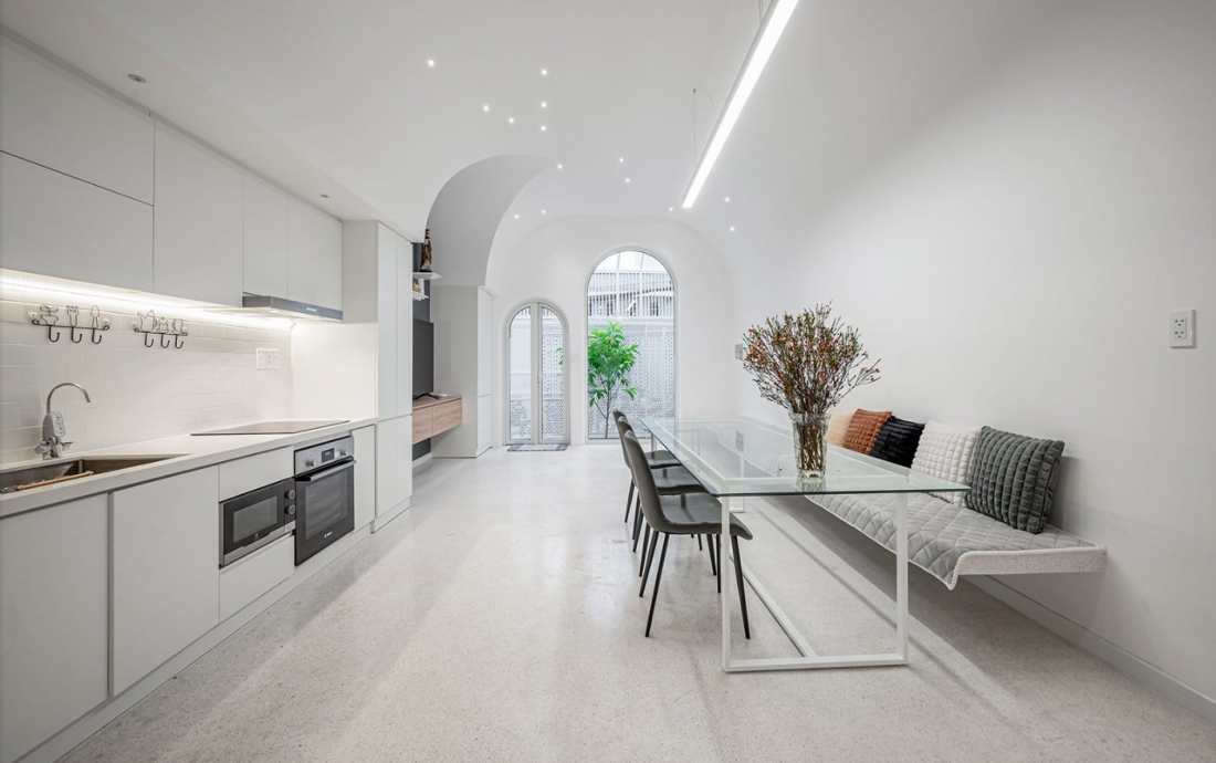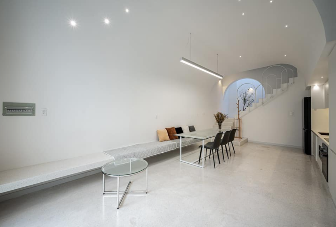 Phòng khách, bàn ăn và bếp bố trí theo chiều dọc ngôi nhà.