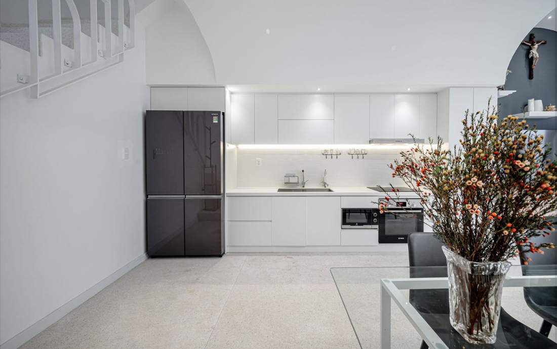 Bếp chữ I kịch trần trên tông màu trắng chủ đạo
