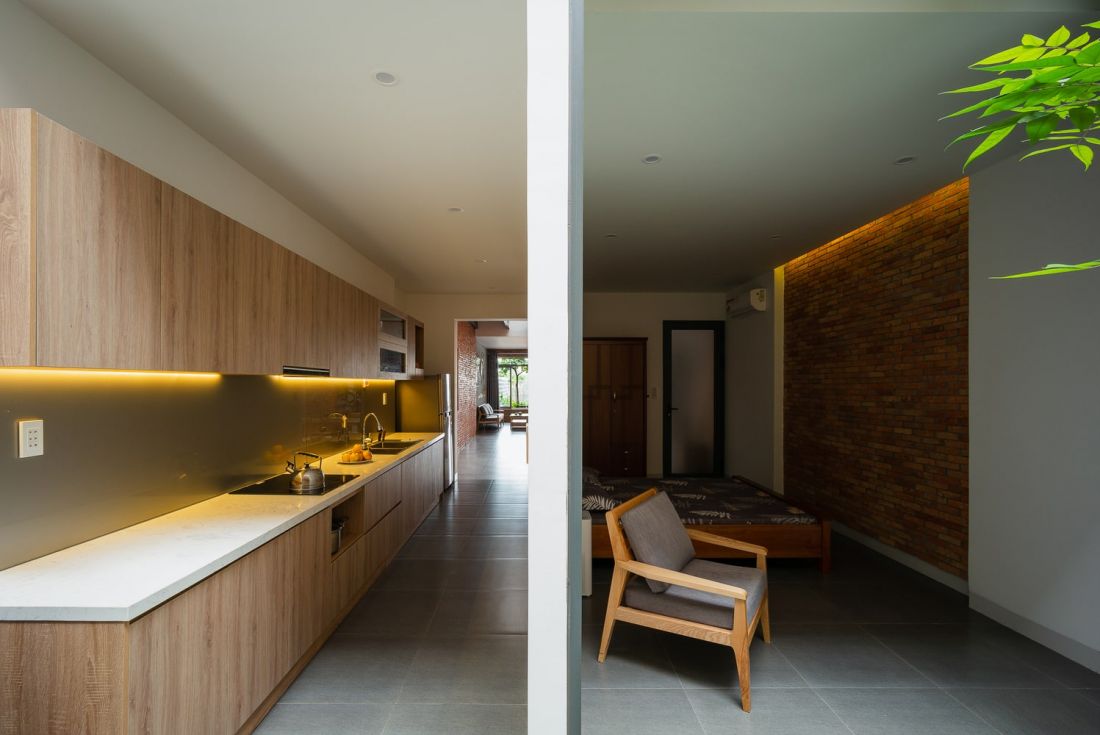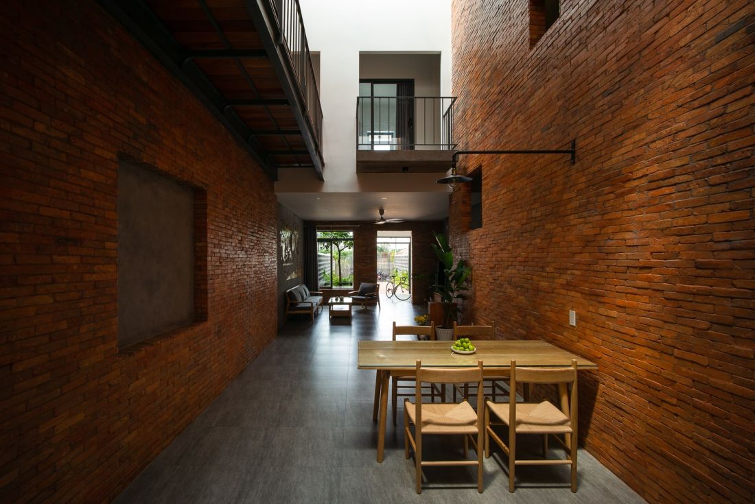 Về chất liệu, ngôi nhà sử dụng vật liệu mang màu sắc của thiên nhiên, điển hình như gạch thô, bê tông và gỗ, những vật liệu này sẽ tồn tại lâu dài, càng dùng chúng càng toát lên vẻ đẹp tự nhiên của thời gian.