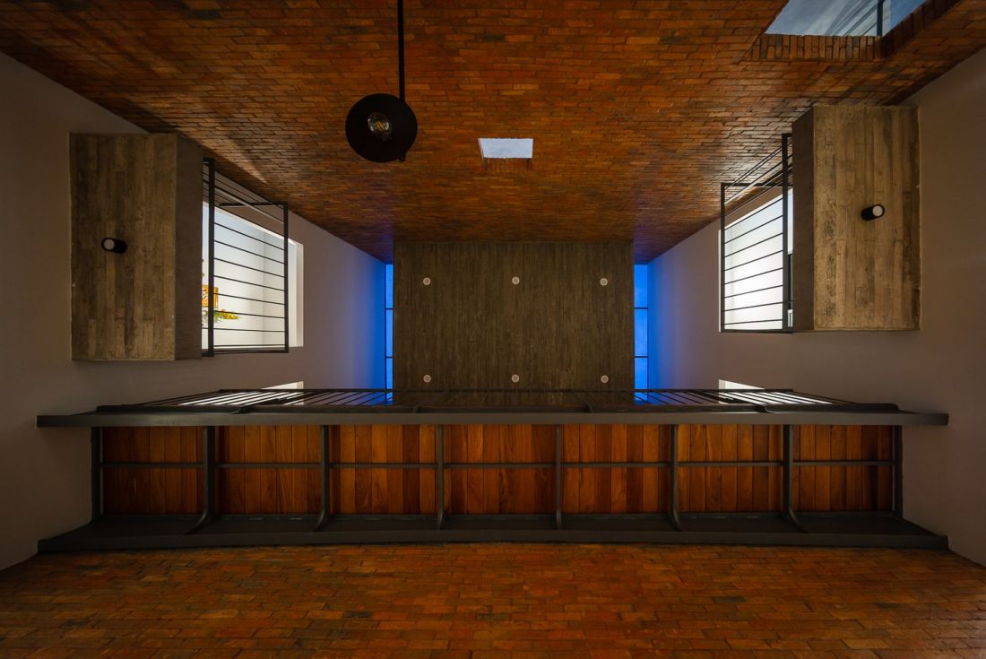 Kiến trúc sư cũng thiết kế hai ban công theo hai khối hộp nhìn ra khoảng trống để mọi người có thể dễ dàng kết nối và tận hưởng không gian chính. Thêm vào đó, kiến trúc sư còn bố trí bàn thờ ở tầng trên hướng ra mặt tiền của ngôi nhà. Nhờ khoảng trống lớn từ trên xuống tầng trệt mà mọi người khi bước vào nhà có thể nhìn thấy bàn thờ ở tầng 2.