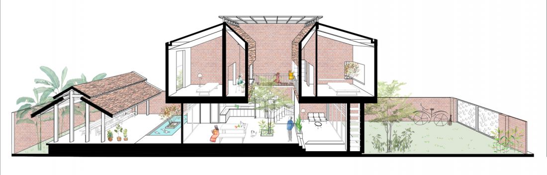 Giải pháp được nhóm kiến trúc sư đề xuất là một ngôi nhà hai tầng, trong đó diện tích xây dựng chỉ hơn một nữa diện tích đất. Phần đất còn lại làm vườn trước và sau nhà vừa là cảnh quan vừa là không gian tụ tập bạn bè, nơi chồng chăm cây, vợ trồng rau, con cái vui chơi.
